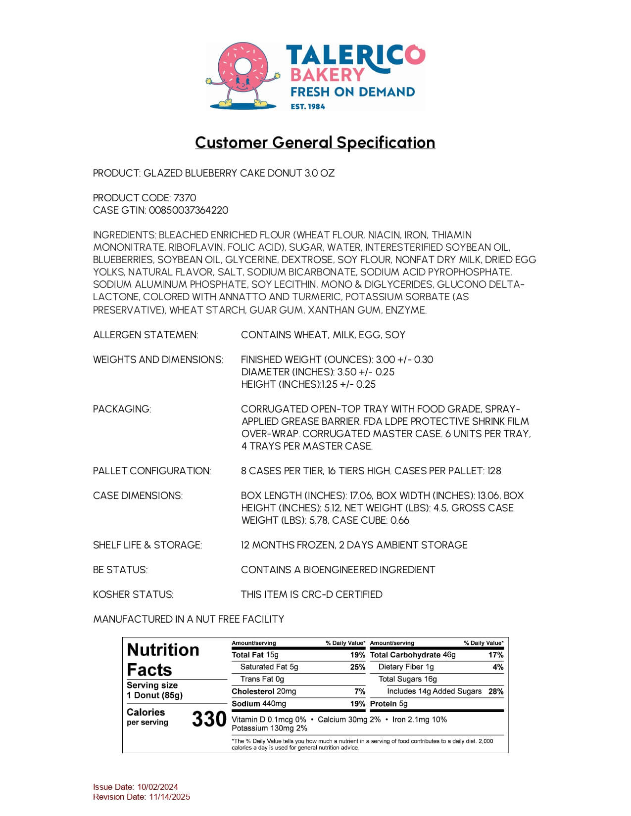 BLEACHED ENRICHED FLOUR (WHEAT FLOUR, NIACIN, IRON, THIAMIN MONONITRATE, RIBOFLAVIN, FOLIC ACID), SUGAR, WATER, INTERESTERIFIED SOYBEAN OIL, BLUEBERRIES, SOYBEAN OIL, GLYCERINE, DEXTROSE, SOY FLOUR, NONFAT DRY MILK, DRIED EGG YOLKS, NATURAL FLAVOR, SALT, SODIUM BICARBONATE, SODIUM ACID PYROPHOSPHATE, SODIUM ALUMINUM PHOSPHATE, SOY LECITHIN, MONO & DIGLYCERIDES, GLUCONO DELTA-LACTONE, COLORED WITH ANNATTO AND TURMERIC, POTASSIUM SORBATE (AS PRESERVATIVE), WHEAT STARCH, GUAR GUM, XANTHAN GUM, ENZYME. -