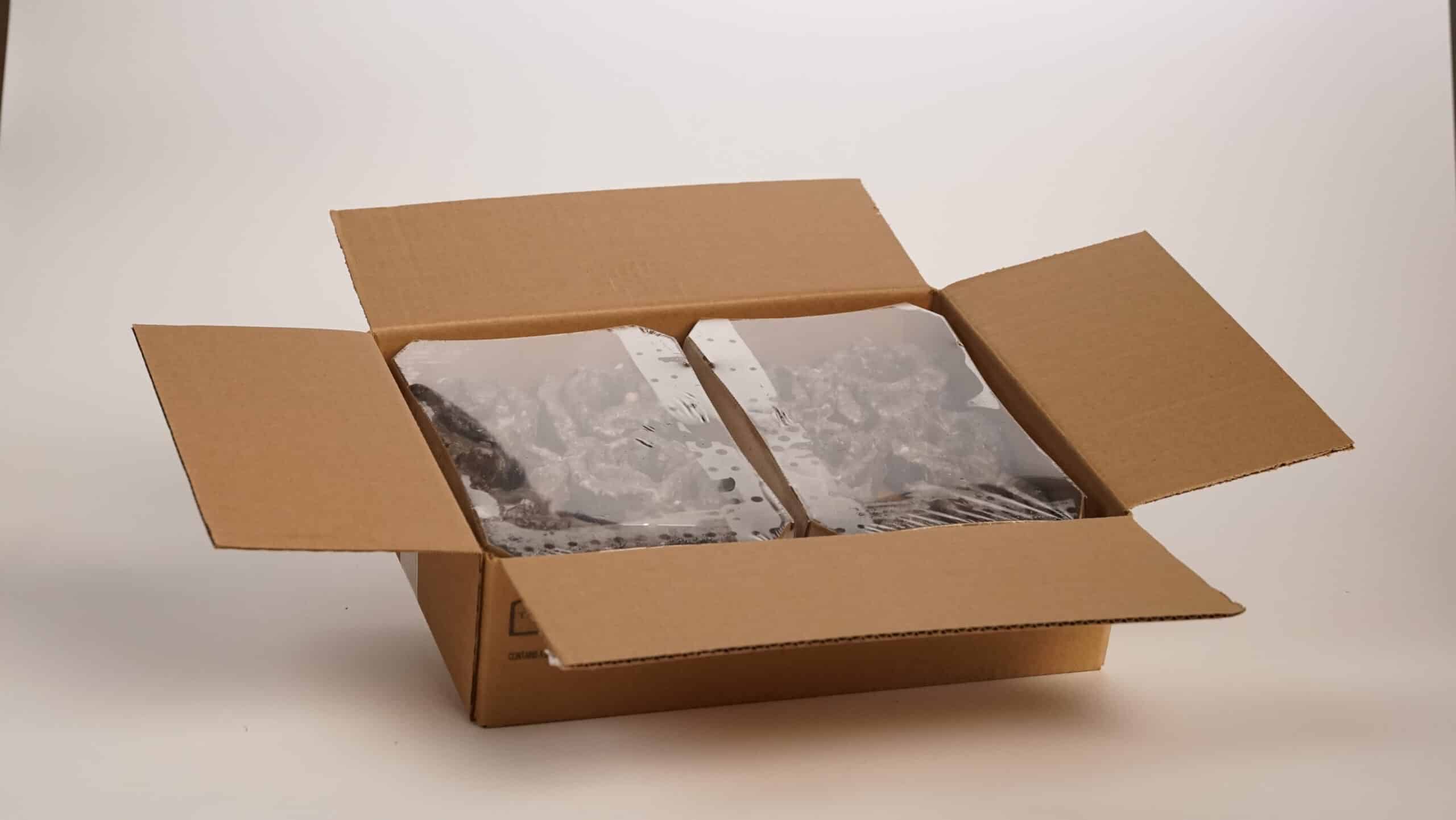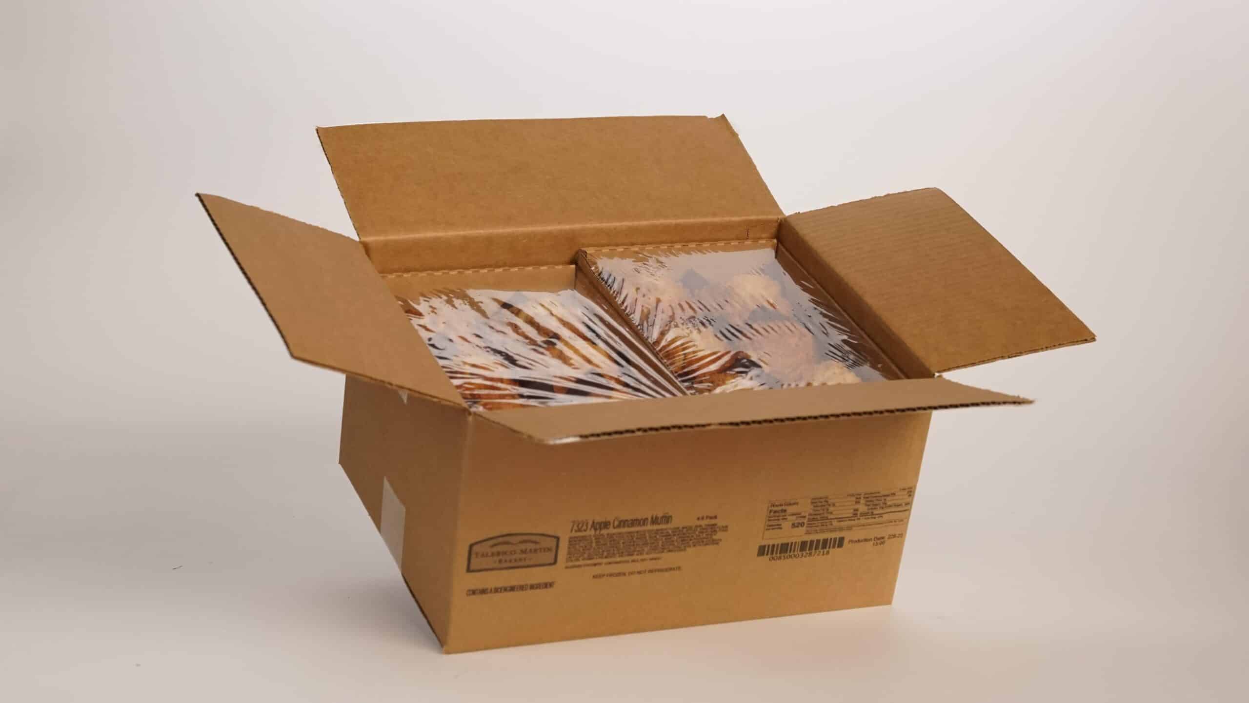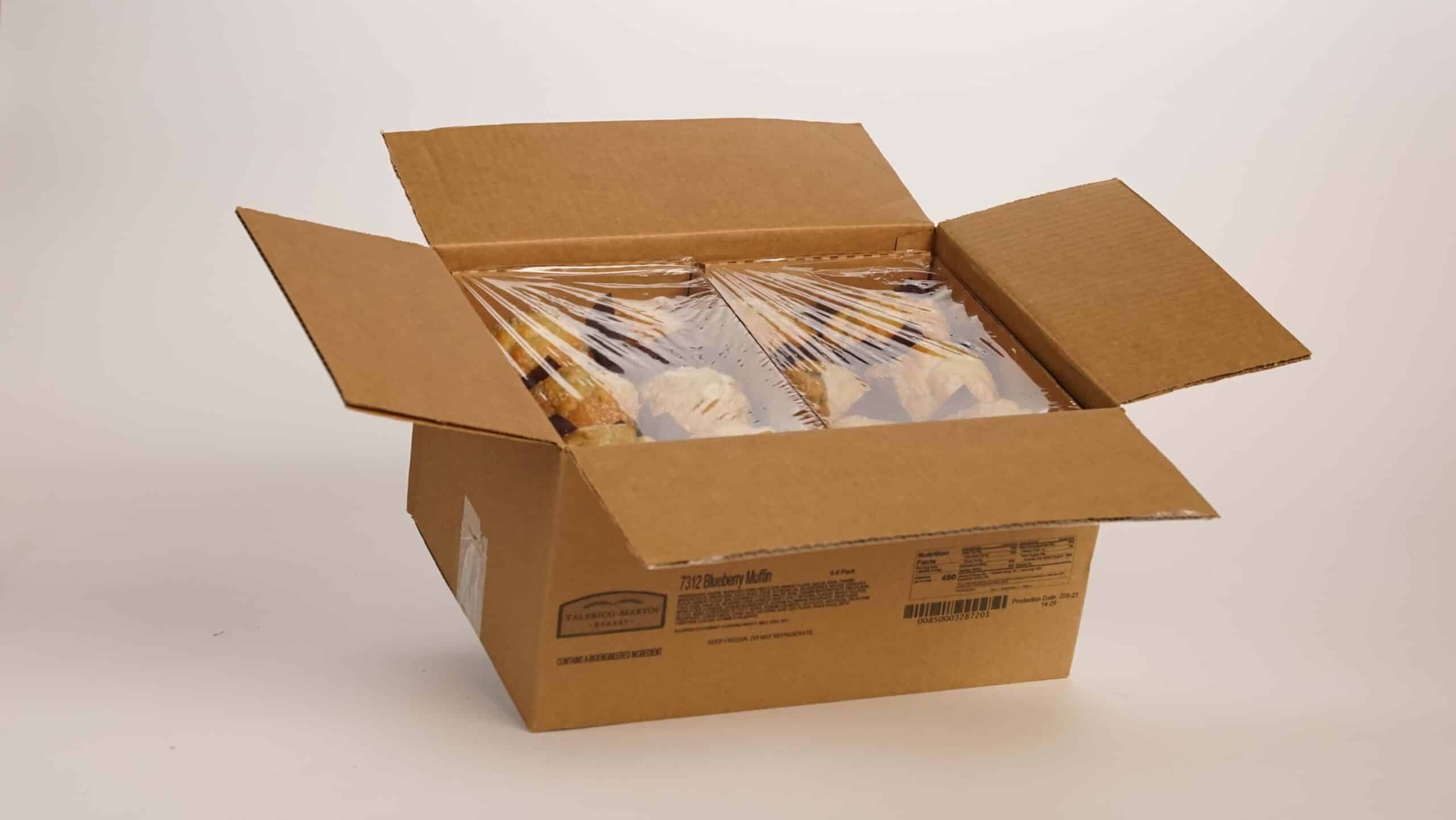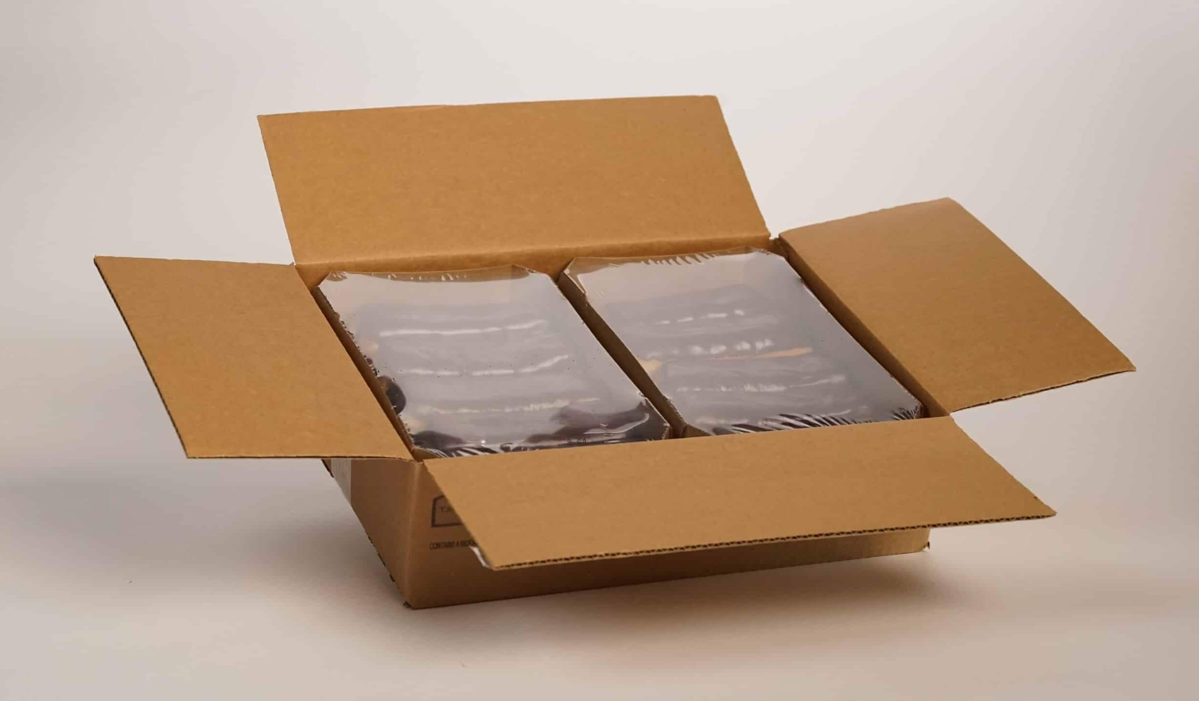 CORRUGATED OPEN-TOP TRAY WITH FOOD GRADE, SPRAY-APPLIED GREASE BARRIER. FDA LDPE PROTECTIVE SHRINK FILM OVER-WRAP. CORRUGATED MASTER CASE. 6 UNITS PER TRAY, 4 TRAYS PER MASTER CASE. -