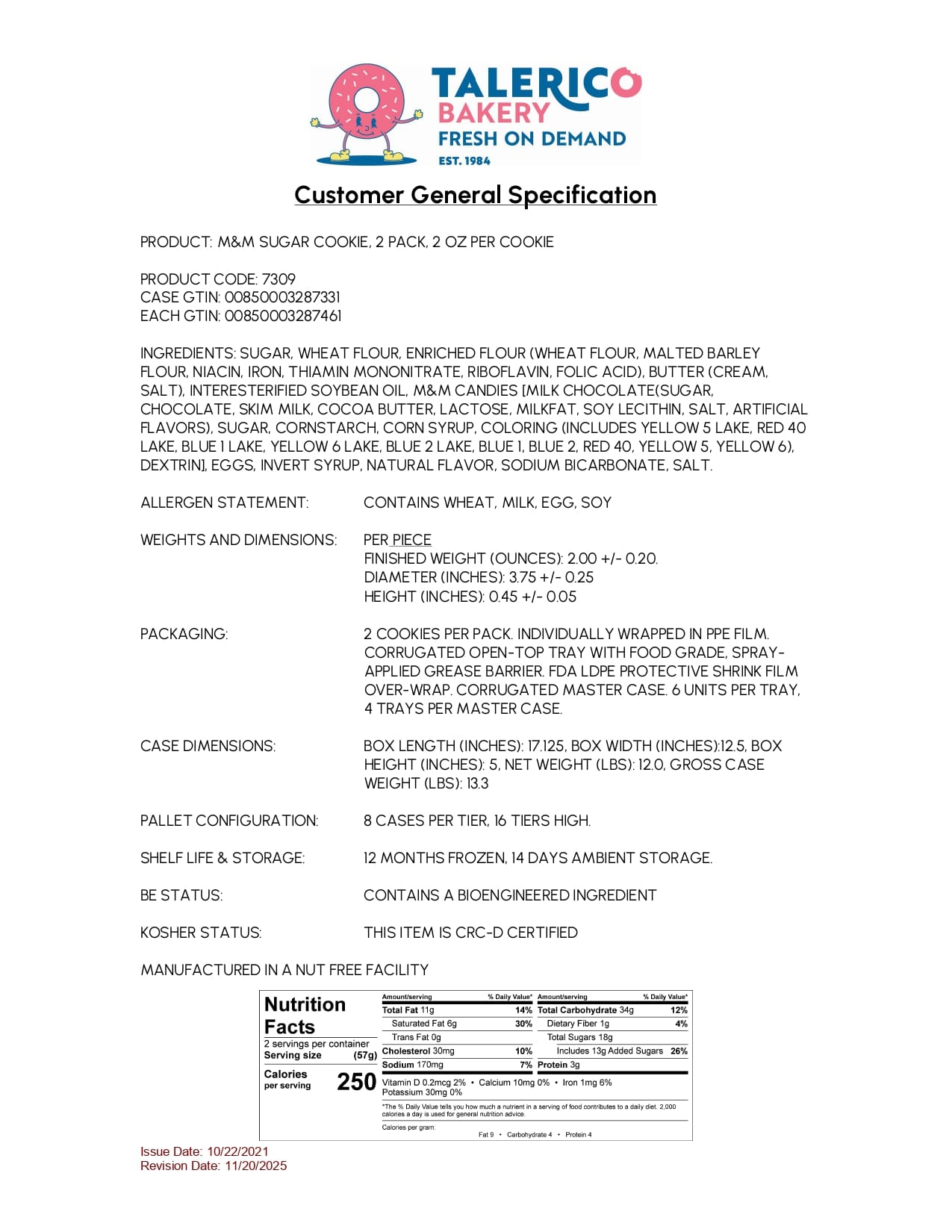2 COOKIES PER PACK. INDIVIDUALLY WRAPPED IN PPE FILM. CORRUGATED OPEN-TOP TRAY WITH FOOD GRADE, SPRAY-APPLIED GREASE BARRIER. FDA LDPE PROTECTIVE SHRINK FILM OVER-WRAP. CORRUGATED MASTER CASE. 6 UNITS PER TRAY, 4 TRAYS PER MASTER CASE. -