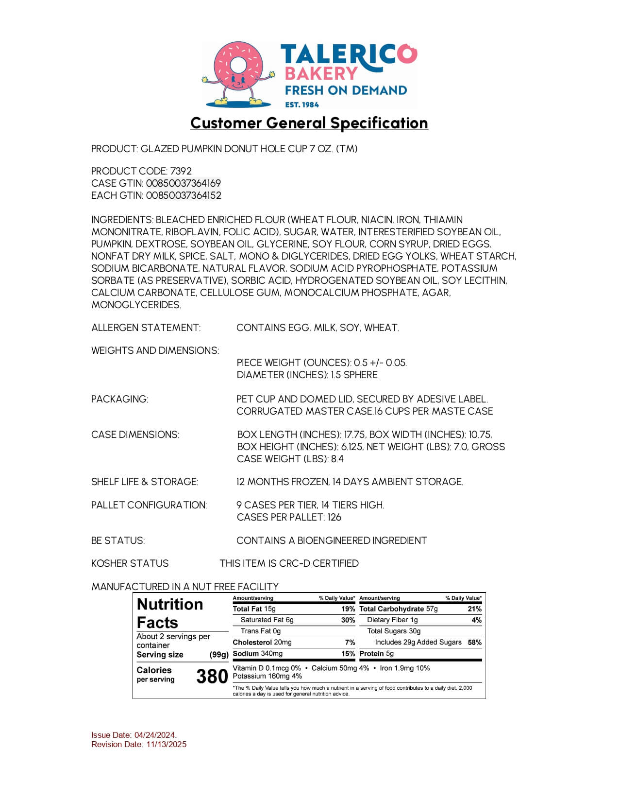 BLEACHED ENRICHED FLOUR (WHEAT FLOUR, NIACIN, IRON, THIAMIN MONONITRATE, RIBOFLAVIN, FOLIC ACID), SUGAR, WATER, INTERESTERIFIED SOYBEAN OIL, PUMPKIN, DEXTROSE, SOYBEAN OIL, GLYCERINE, SOY FLOUR, CORN SYRUP, DRIED EGGS, NONFAT DRY MILK, SPICE, SALT, MONO & DIGLYCERIDES, DRIED EGG YOLKS, WHEAT STARCH, SODIUM BICARBONATE, NATURAL FLAVOR, SODIUM ACID PYROPHOSPHATE, POTASSIUM SORBATE (AS PRESERVATIVE), SORBIC ACID, HYDROGENATED SOYBEAN OIL, SOY LECITHIN, CALCIUM CARBONATE, CELLULOSE GUM, ONOCALCIUM PHOSPHATE, AGAR, MONOGLYCERIDES. -
